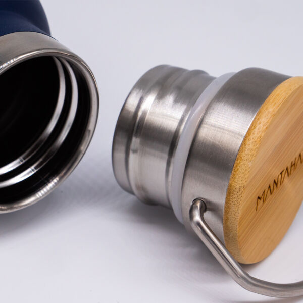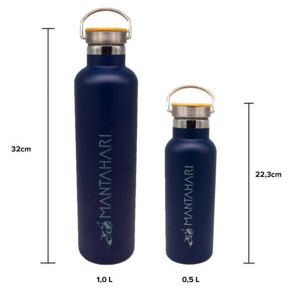 Die 1 Liter Kupfer-Vakuum-Isolierflasche mit einer Doppelwand aus Edelstahl sieht nicht nur sensationell aus mit dem gelasten Logo, sie hält auch deine Getränke für 48 Stunden kalt und für mindestens 12 Stunden heiß. Der Bambus Deckel mit dem ikonischen Mantahari Schriftzug rundet die Flasche perfekt ab.